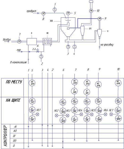 Схема автоматизации сушилки предусматривает контроль температуры в камере, контроль и регулирование давления пара в трубопроводах, наличие продукта подаваемого в сушильную камеру, программное управление циклом сушки, местное и дистанционное управление электродвигателями.